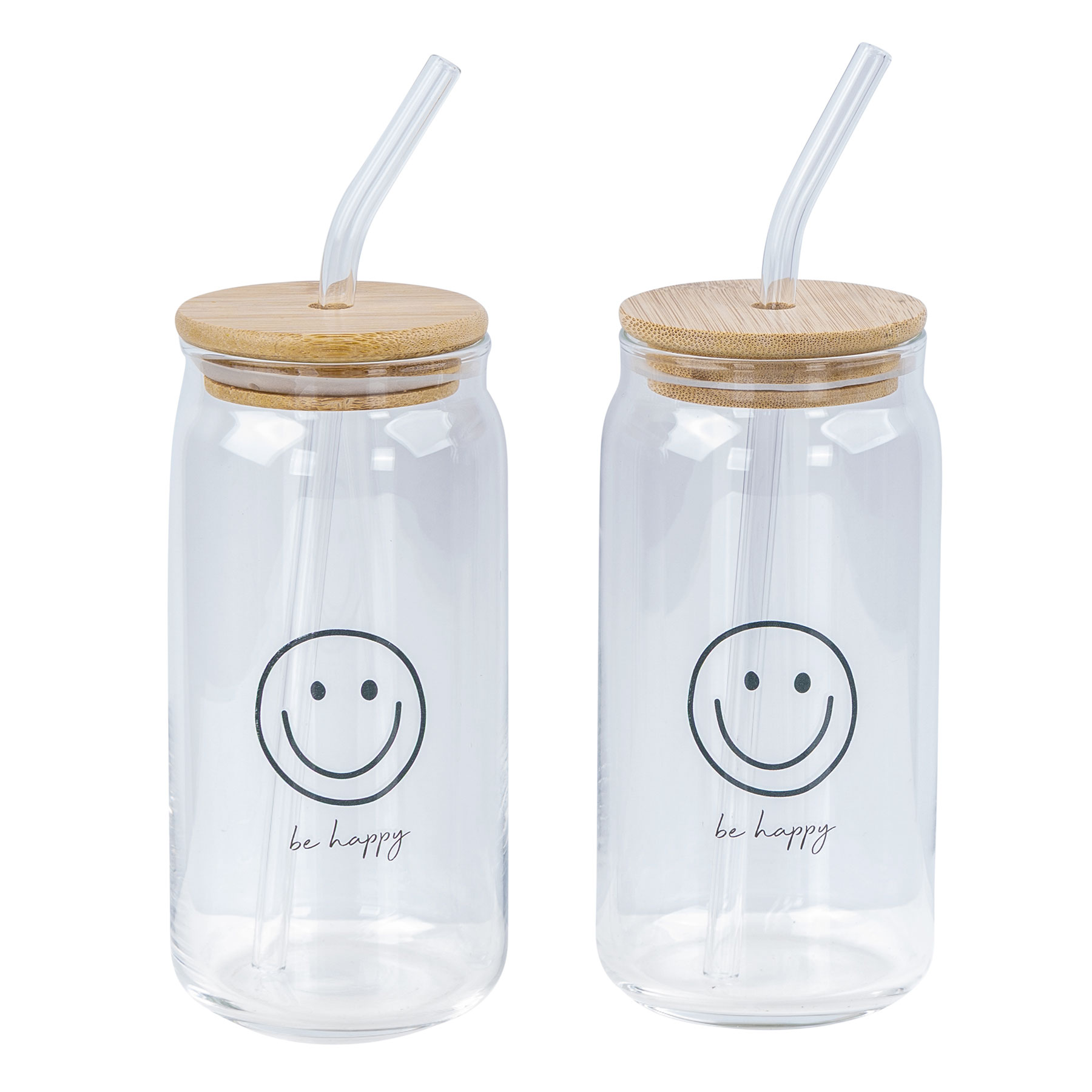 - Lieferumfang: Sie erhalten das abgebildete 2er Set Trinkgläser mit Smiley-Motiv & Schriftzug "Be Happy" (inkl. Glas-Strohhalme & Bambusdeckel - ohne Deko)