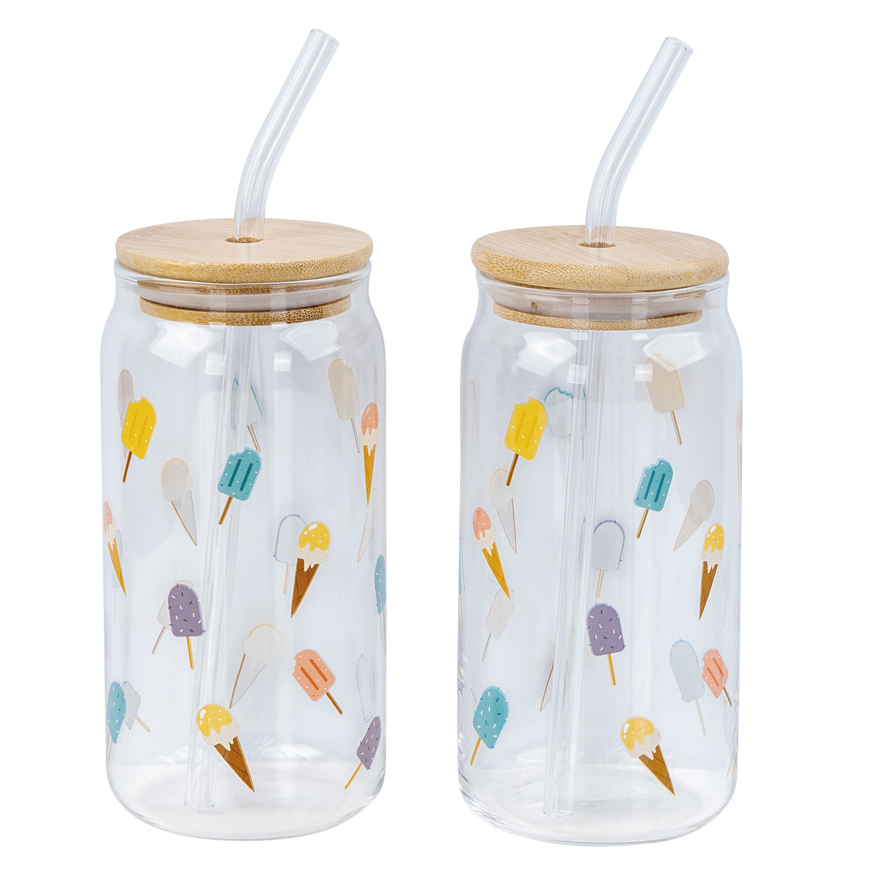 Produktinformationen "2er Set Glas Deckel Strohhalm 500ml Be Happy Bambusdeckel Trinkglas Ice Kaffee"