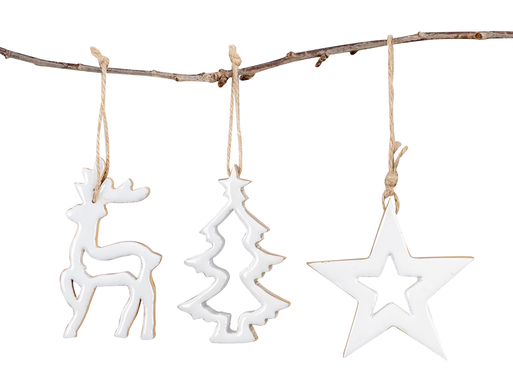 Diese Weihnachtsanhänger verbinden festliche Eleganz mit natürlichem Charme. Die weiß lackierten Motive aus naturbraunem Mangoholz sind wie gemacht für eine stimmungsvolle Adventszeit.