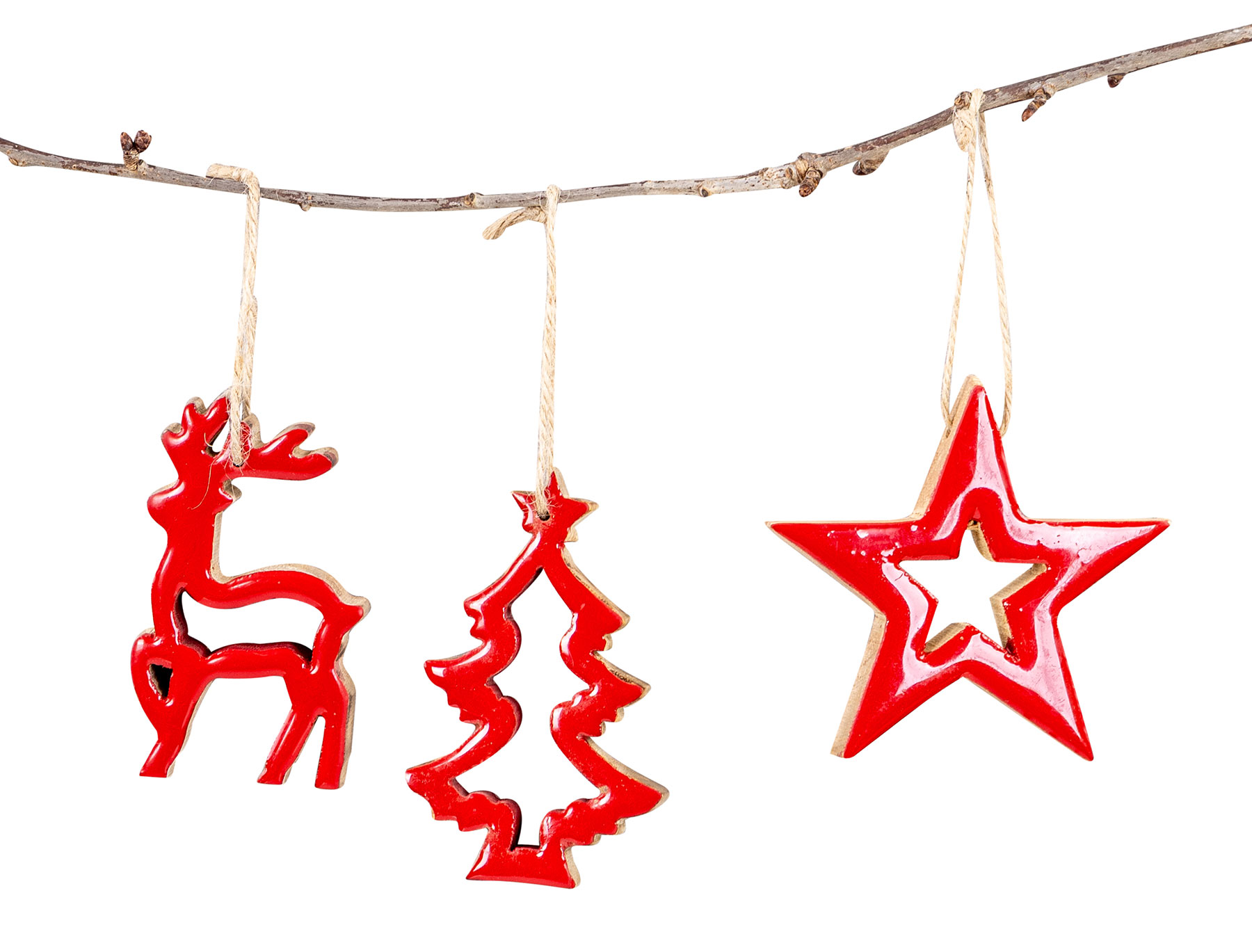 Die weihnachtlichen Deko-Anhänger in Form von Stern, Hirsch und Weihnachtsbaum setzen festliche Akzente und lassen sich vielseitig kombinieren.,