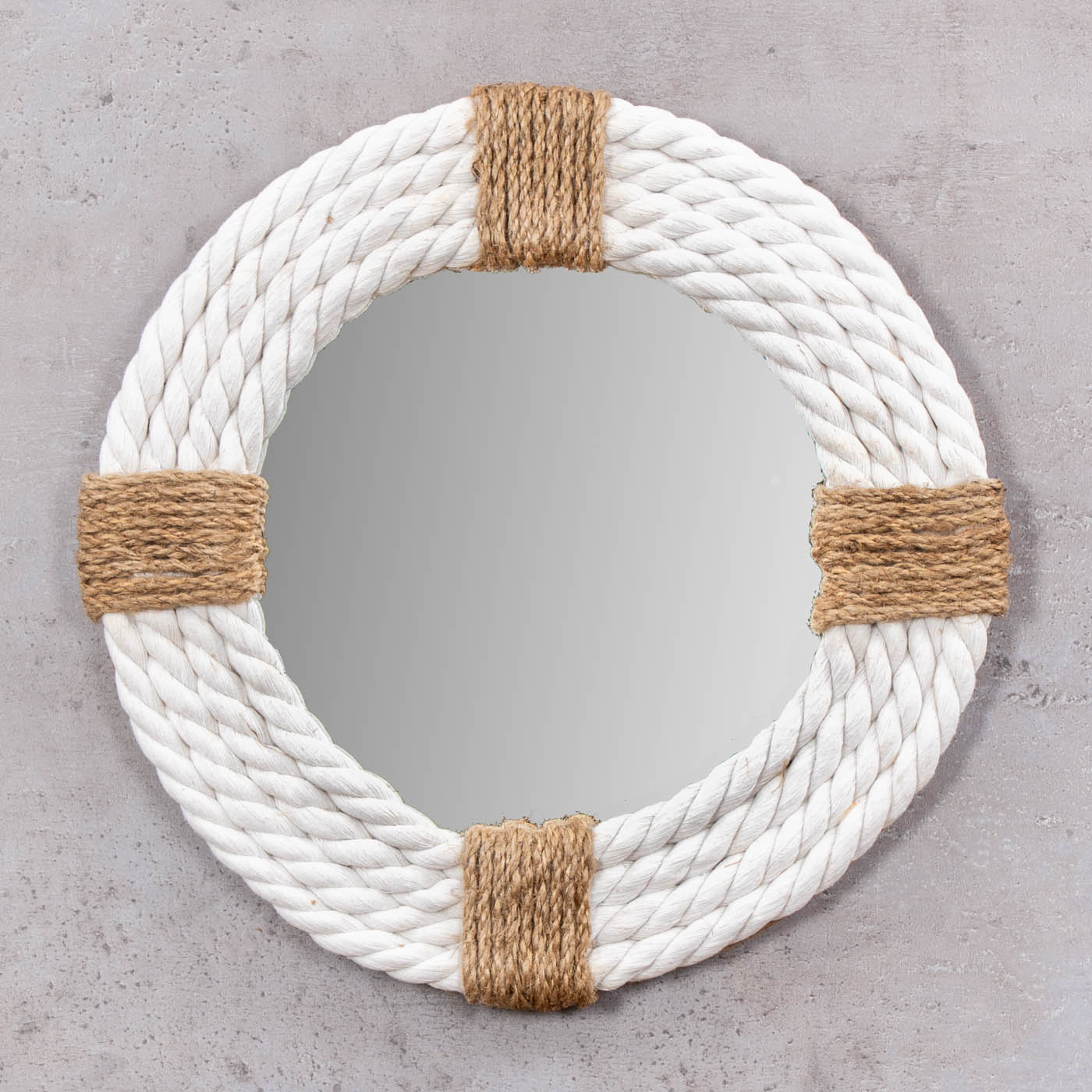 Dieser Wandspiegel bringt maritimen Charme in Ihr Zuhause. Die Spiegelfläche wird von einem weißen Seil und naturbraunen Juteband umrahmt, das dem Spiegel einen frischen, nautischen Flair verleiht – perfekt für einen Hauch von Küstenglück.